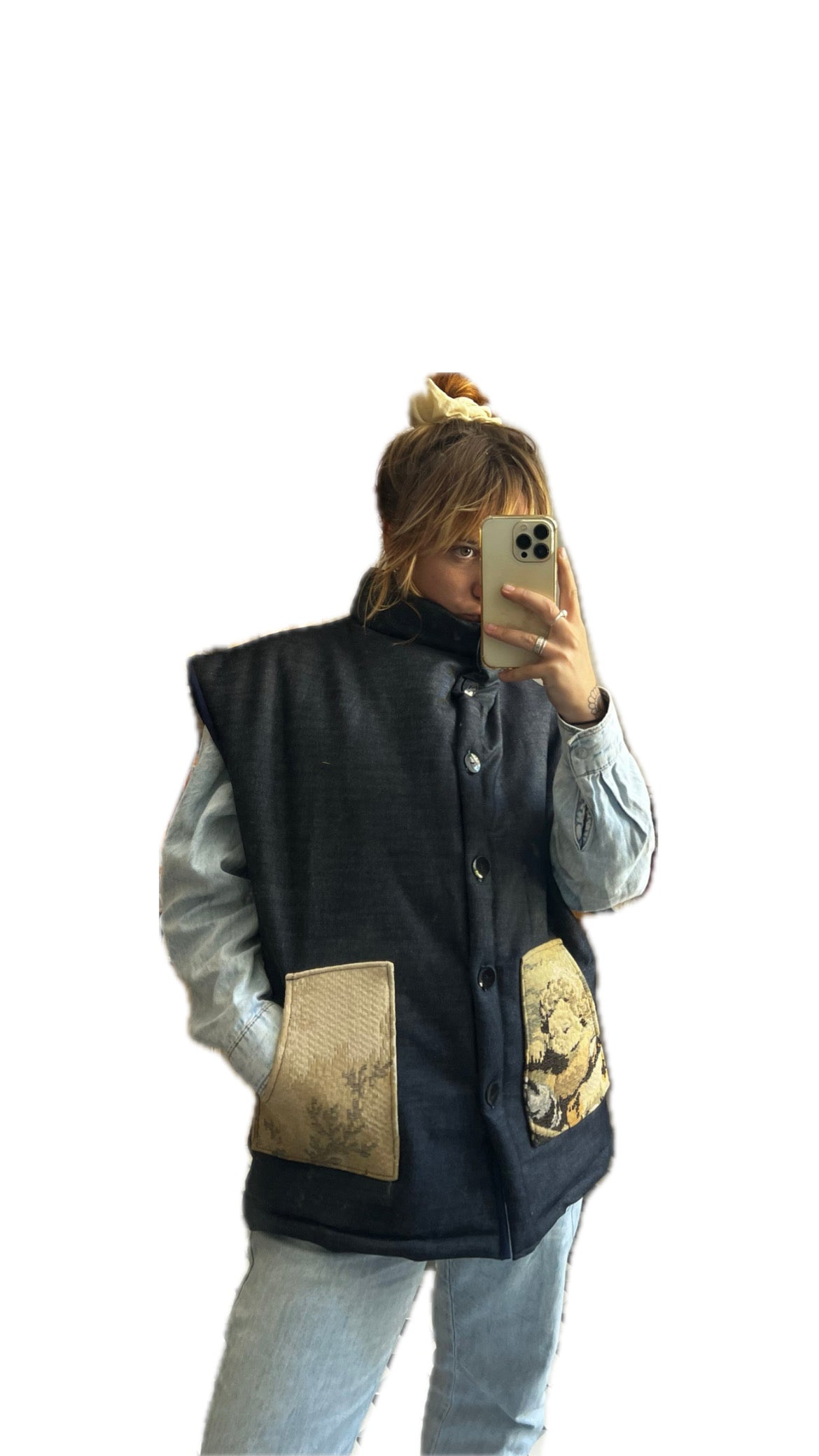 Cette doudoune sans manches a été cousue avec des tissus upcyclés comme cette tapisserie de folie présente dans le dos de la pièce ❤